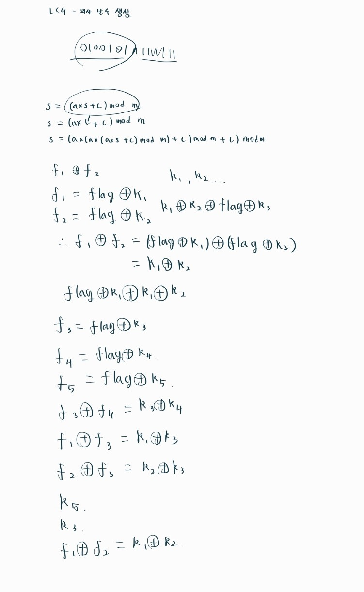 대부분의 LCG는 m,c,a 중 하나는 알려주는데 이 문제의 경우에는 전부 65565비트짜리의 소수였다. 대부분의 문제를 풀고 어떻게 풀어야하나 고민했지만 결국 풀지는 못했다.