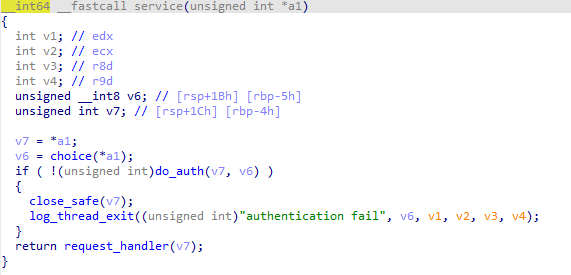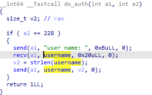 Service call do_auth() internally. In do_auth, we can insert Username, followed by the Flag, so if we fill the buffer so that there are no 0x00 bytes, we can get the Flag on the output.