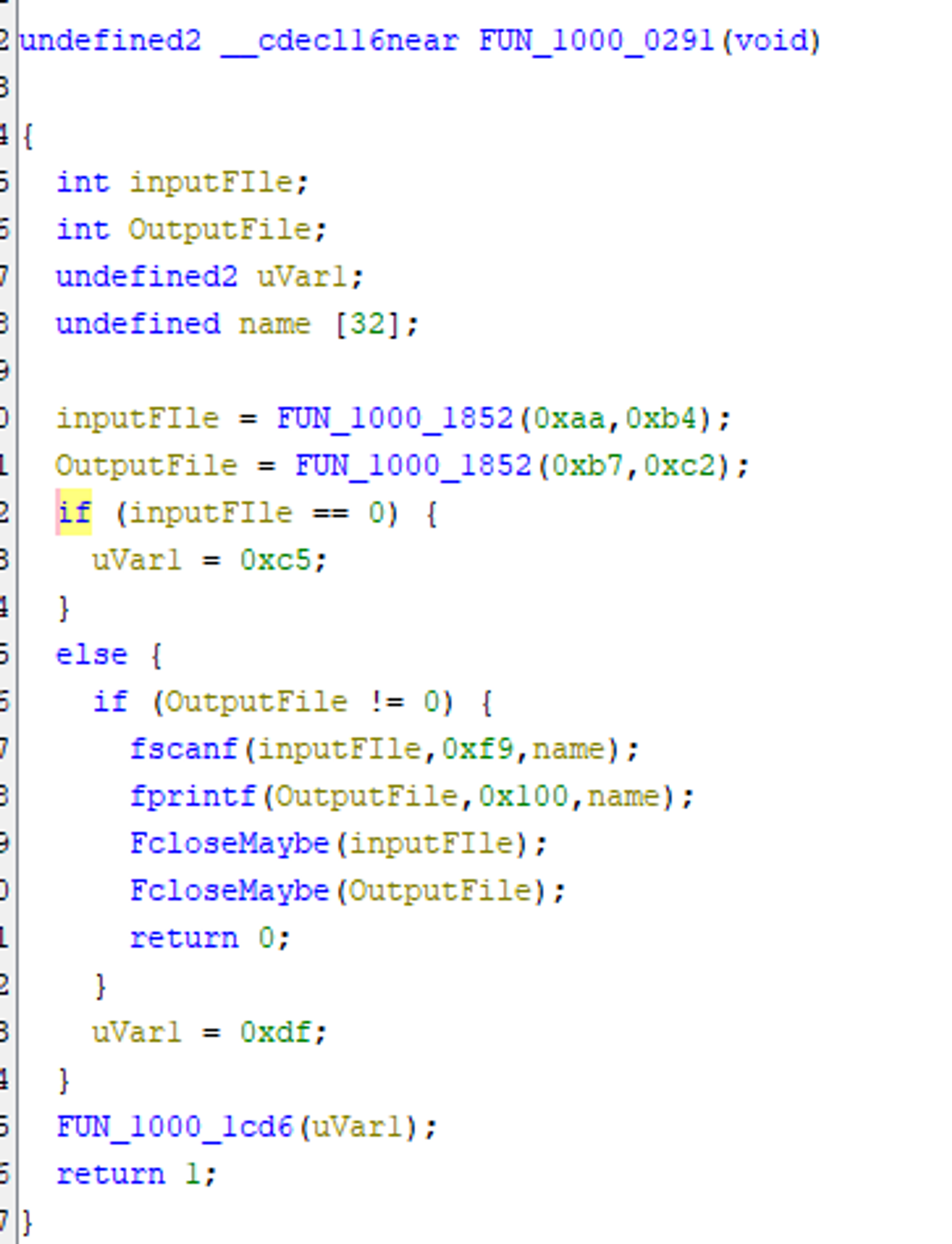 일단 컴파일 된 바이너리를 Ghidra로 뜯어보면, C++ 소스와 다르게 저런 식으로 Fopen과 파일 이름을 불러오게 된다(FUN_1000_1852 함수) 그리고 두 개의 16진수를 인자로 받는데 나는 저 두 인자가 뭔지 몰랐으나, 팀원의 도움으로 16비트 OS에서 File관련 I/O 함수를 사용할 떄, 데이터 구조체(파일 이름 등)을 Data Segment + 특정 오프셋에 저장한다고 한다.