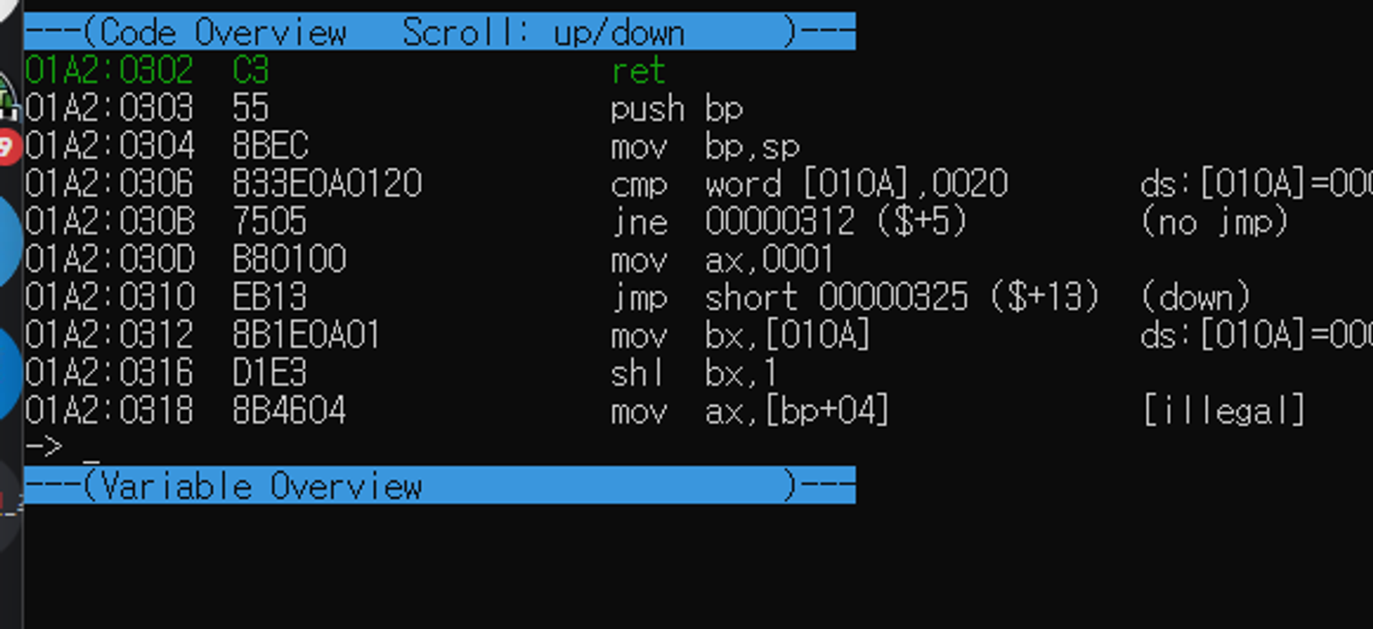 x86이나 ARM같은 익숙한 환경이었다면 참 쉬운 문제가 되었을텐데, 위에서 볼 수 있 듯 DosBox를 통한 16비트 환경에서 돌아가기에 문제가 조금 어려워진다.
